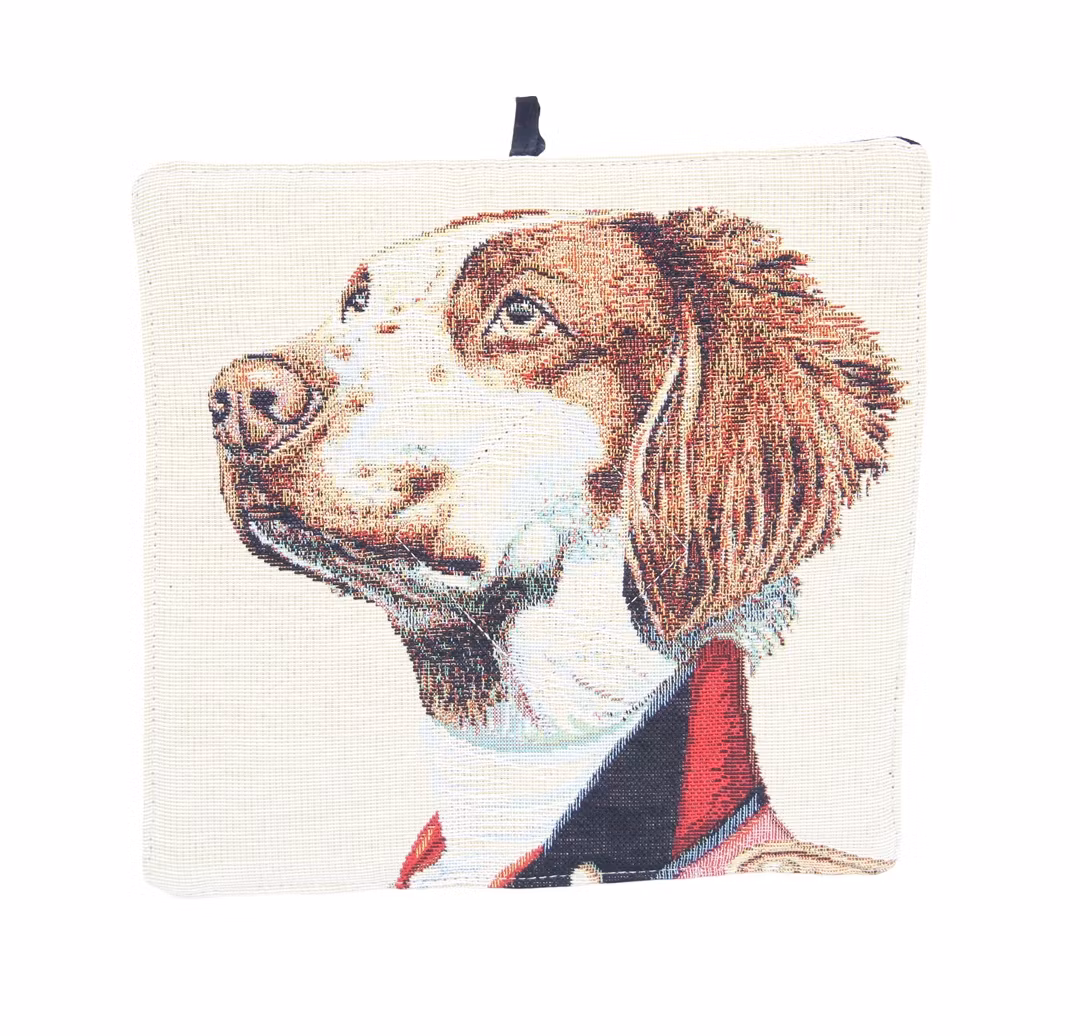 Underbara grytlappar med Brittany Spaniel som motiv, vackert, dekorativ och praktisk, gjord i spanskt jacquardtyg. Grytlapparna mäter 19 cm x 19 cm och är handsydda i Sverige. En utmärkt present som du garanterat blir ensam om! Priset avser ett PAR grytlappar.